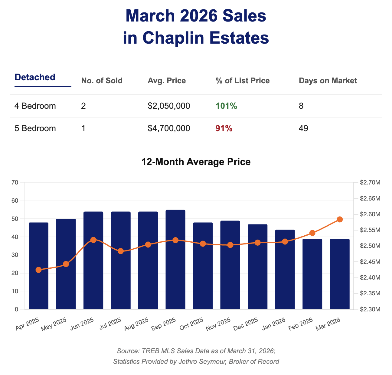 By Jethro Seymour | The Seymour Team After a quiet February with no closed sales, March delivered exactly what the spring market promised — 3 detached homes sold, 8 new listings entered the market, and the 12-month rolling average climbed to $2,583,941, up 6% year-over-year. The momentum that was building is now visible in the numbers. Chaplin Estates is moving. The month's sales also illustrated a theme that runs through this market consistently: correctly priced homes move fast and over asking, while premium-priced properties require patience. Both outcomes happened in March — on the same street. Missed the February recap? Read the February 2026 Chaplin Estates Market Report here. Sale Price