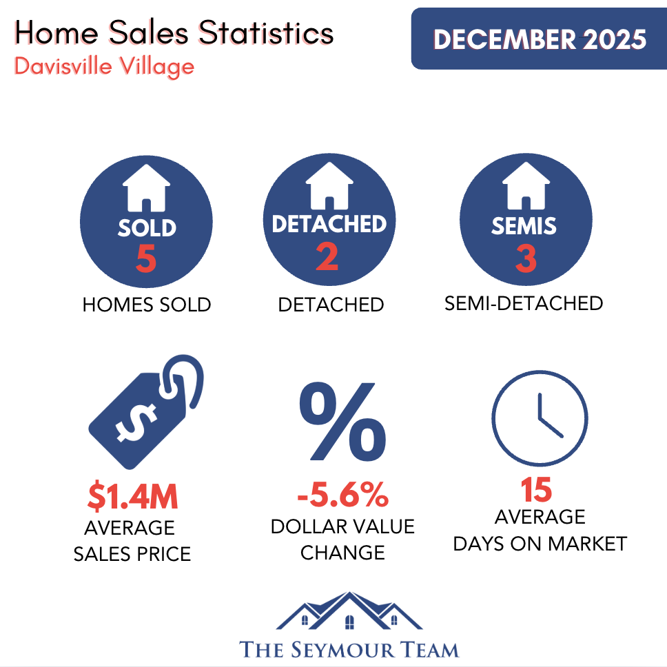 Davisville closed December with 5 homes sold. The sales included 2 detached and 3 semi-detached homes, with 60% selling at or above the listing price.