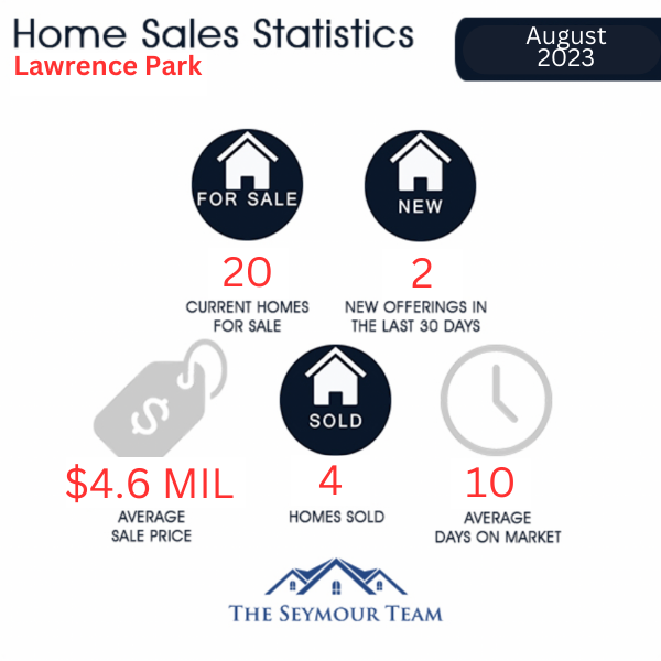 As of August 8, 2023, there are twenty homes available in the Lawrence Park area, ranging in price from $2,995,000.00 for a detached home on Blythwood Road (66 days on the market) to $14,680,000 for a detached home on Lewes Crescent (37 days on the market).
