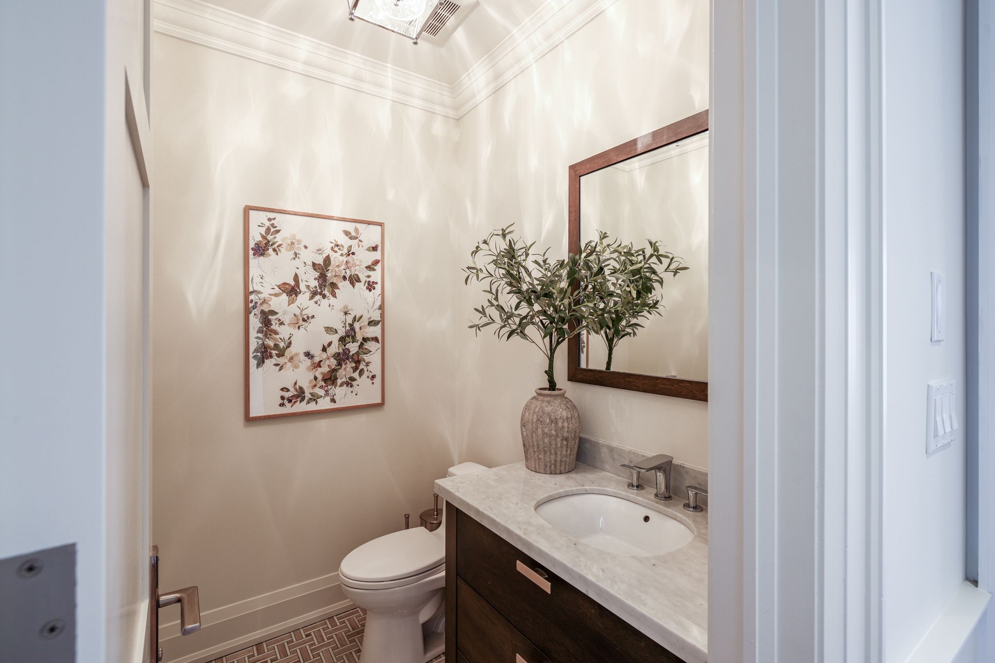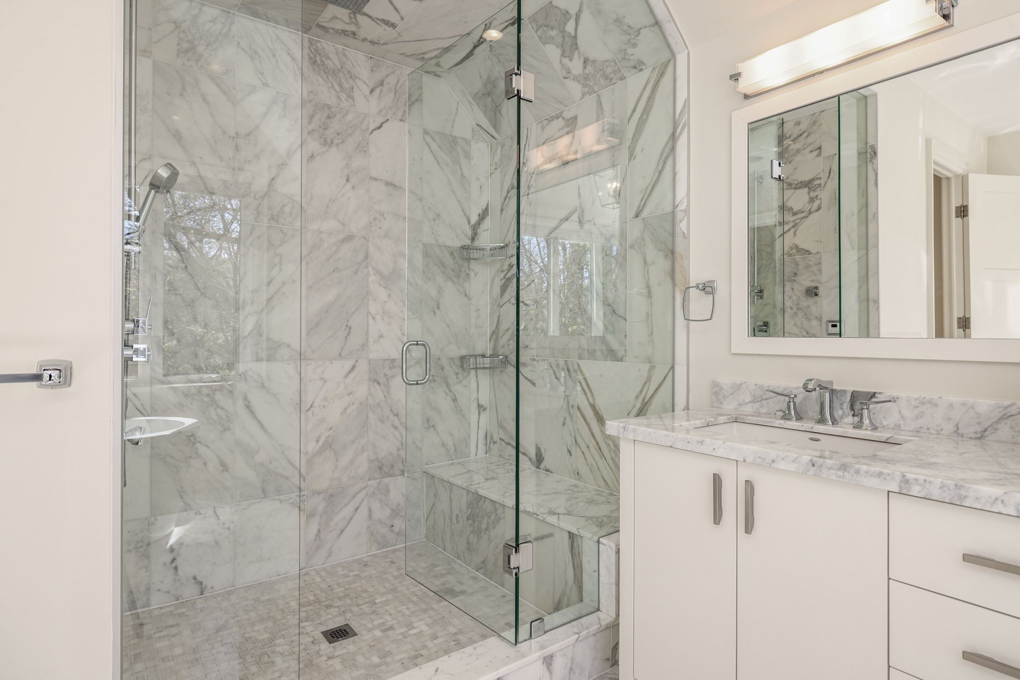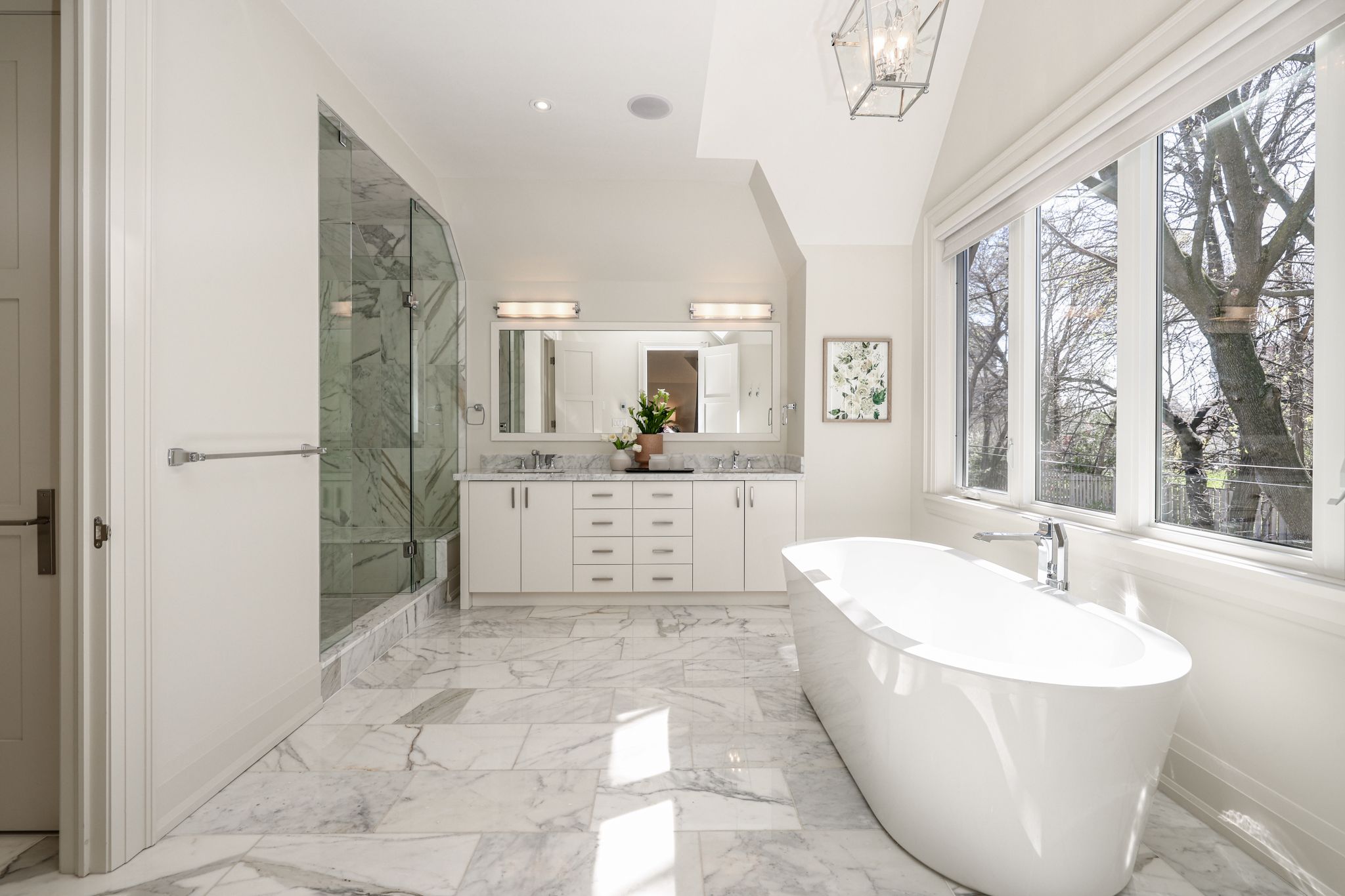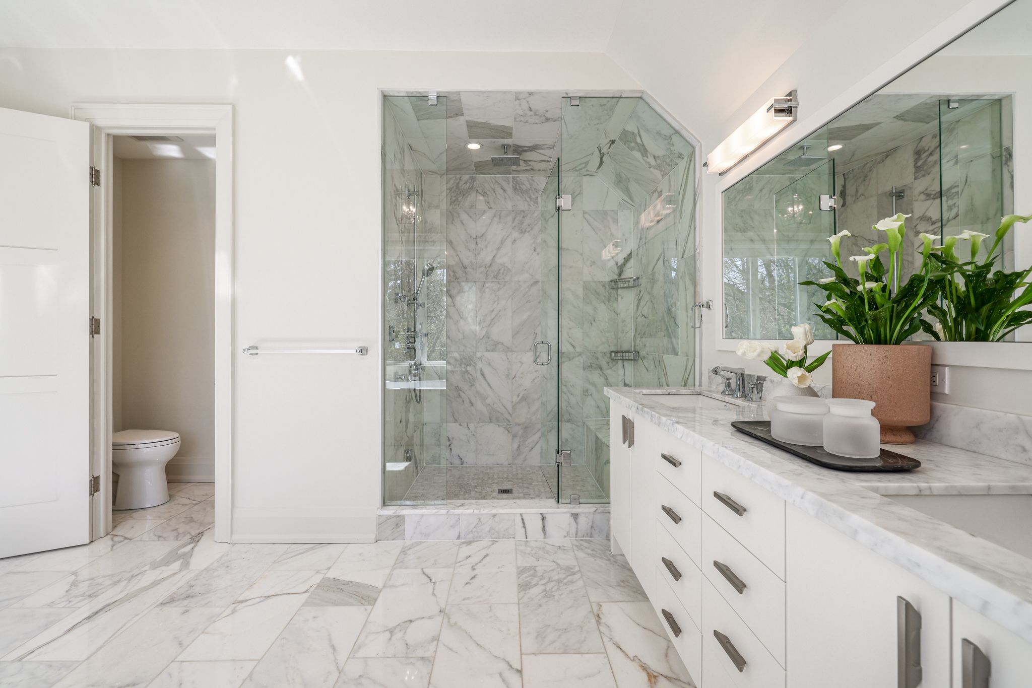 The second floor continues the generosity. The primary suite features a cathedral ceiling rising to 11 feet, a Juliette balcony, and a dedicated dressing area. Bedroom 2 has its own ensuite and walk-in closet. Bedroom 3 is oversized — larger than two home offices combined. In total, the upper level includes three full bathrooms, upper-floor laundry, and space that never forces compromise. Add a powder room on the main and a full bathroom in the lower level, and this home delivers five bathrooms in all.