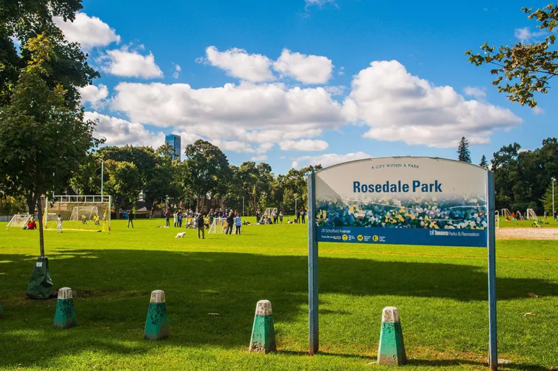 At the heart of the neighbourhood lies Rosedale Park, a community gathering spot that features tennis courts, a baseball diamond, sports fields, a playground, and an outdoor skating rink in the winter. To the west, Ramsden Park provides another major green space with updated recreation facilities and off-leash areas for dogs.